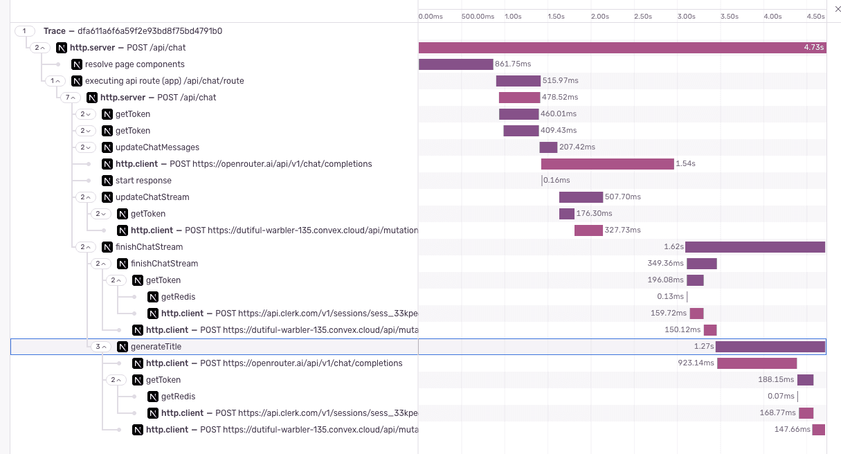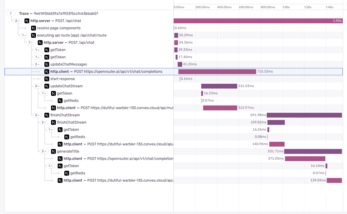 As you can see, here the request to Openrouter is sent in less than 50ms. Which is in my TBLR budget. This made a very big difference on the feel of the chat, because instead of having a spinner; you could get the token stream almost instantly, making the app feel faster.