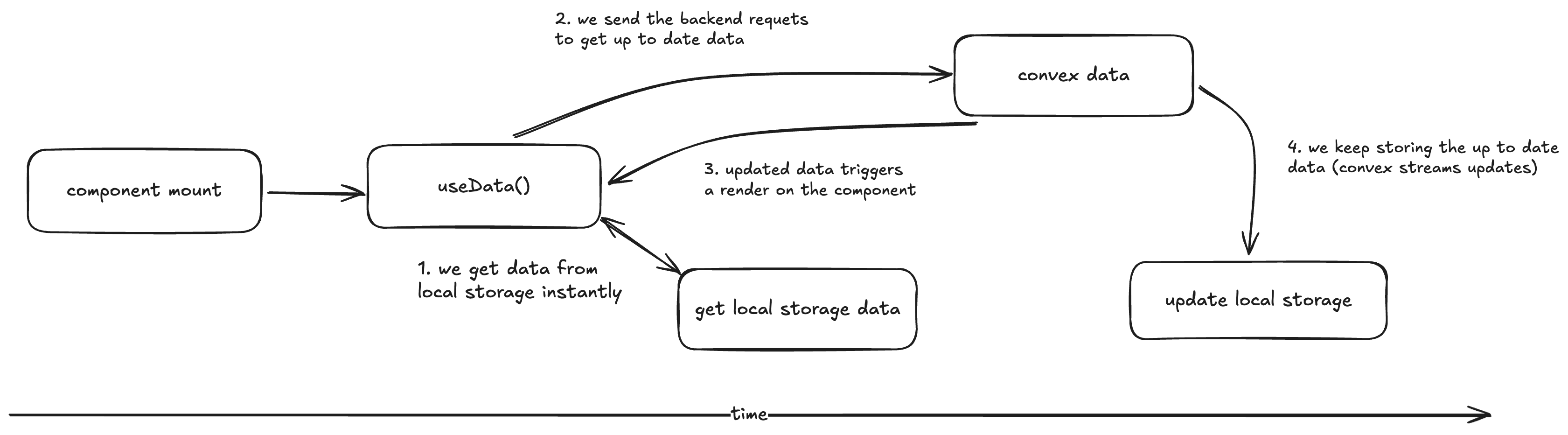 type UseSyncProps< ConvexQueryReference extends FunctionReference<"query">, Args extends FunctionArgs<ConvexQueryReference> | "skip",> = { args: Args; queryFn: ConvexQueryReference; key: (args: Args) => string; options?: { isLocallyStored?: boolean; };};export const useSync = < ConvexQueryReference extends FunctionReference<"query">, Args extends FunctionArgs<ConvexQueryReference> | "skip",>({ args, queryFn, key, options,}: UseSyncProps<ConvexQueryReference, Args>) => // useQuery from tanstack useQuery({ ...convexQuery(queryFn, args), initialData: () => { if (options?.isLocallyStored) { const rawData = localStorage.getItem(key(args)); if (rawData) { return JSON.parse(rawData); } } }, });This works very, very well. In the future I will add some parameters like from where the data is coming (to restrict interaction when the data is coming from local storage, to avoid weird sync issues).