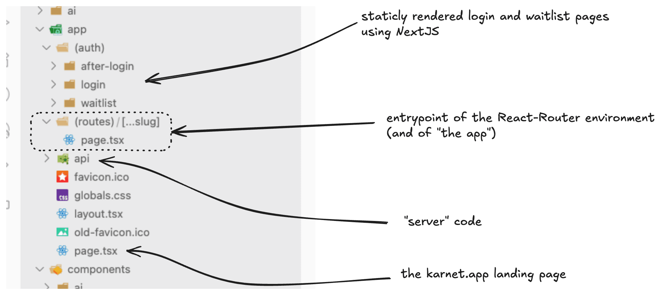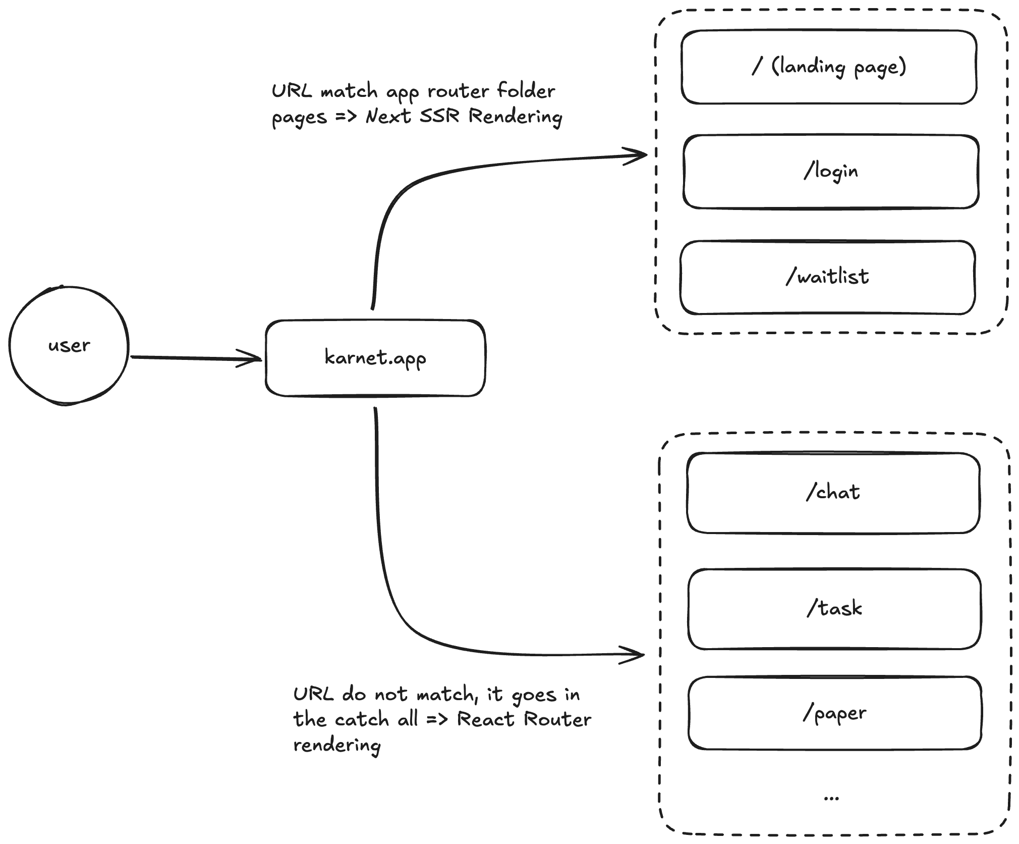 - I want to have the landing page statically rendered using all Next features and I don't want to use a subdomain or subpath in my application. (I could host the landing page on `karnet.app` and have the application on