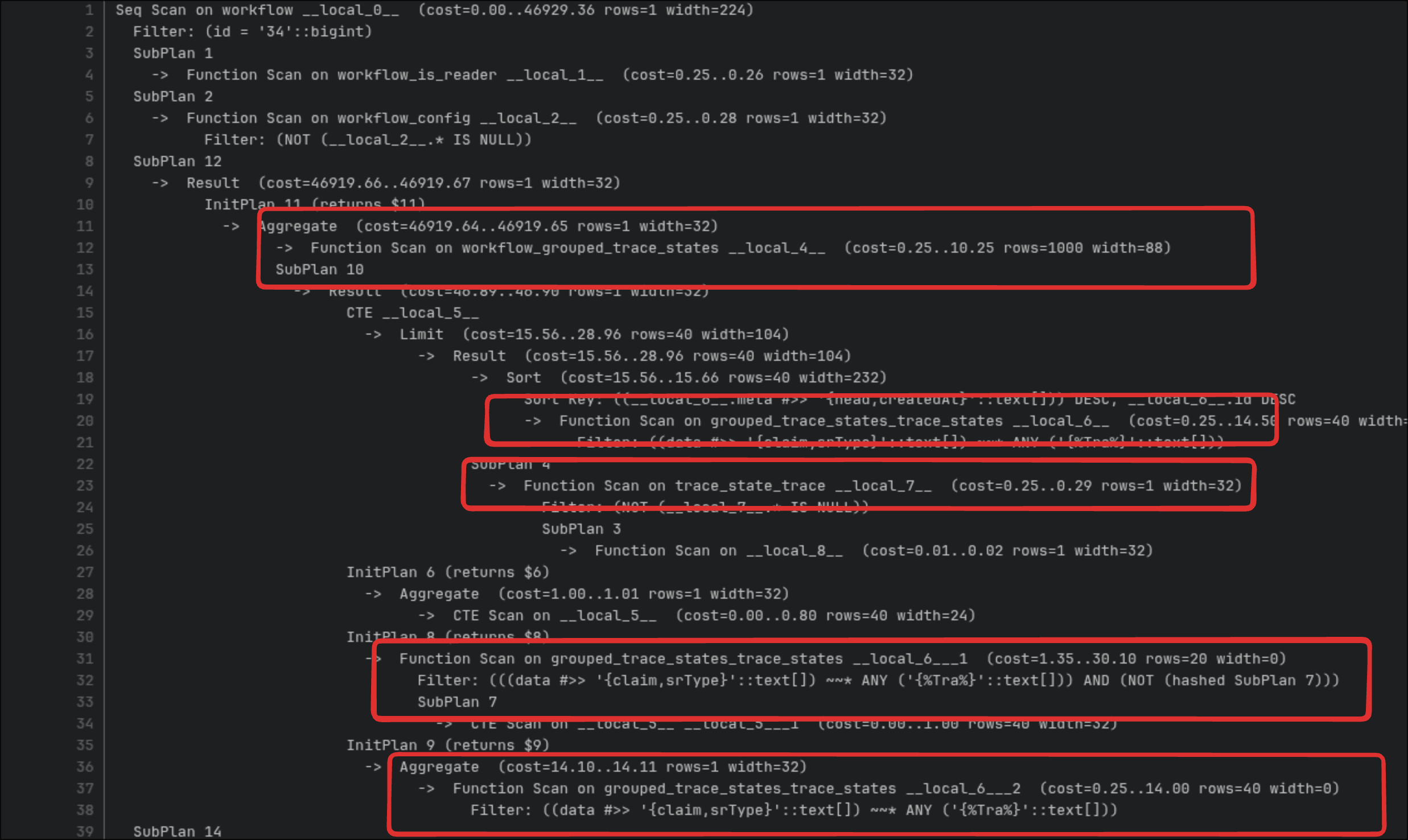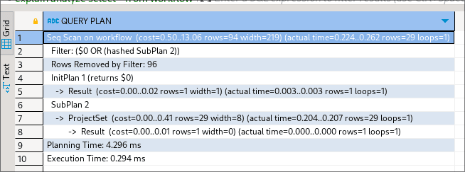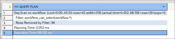 As you can see, Postgres performs two plan (the first one is to check if you are a superadmin, this is not relevant). The second one is the actual function planning, and then use it to filter the workflows.