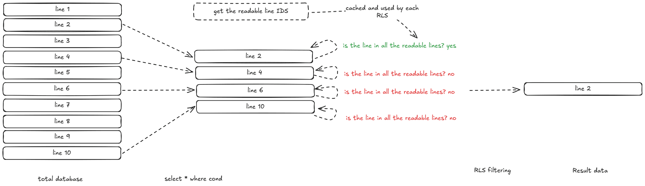 The right solution is to get all the line the user can read, in one query, and use the result of this query as the RLS. Moving from a “can I read the line 23432?” to a “is the line 23432 in the array of authorized lines?”.