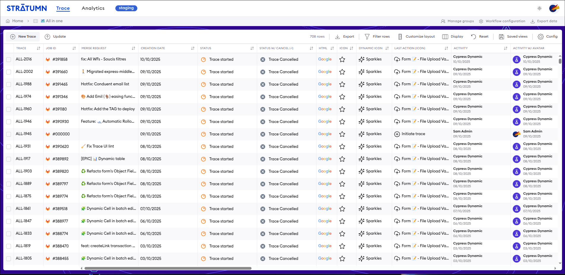 Stratumn is an aging piece of software, built many years ago. It has been serving multiple clients in production around the world for more than 7 years now. At the scale the software operates, many pieces have been deteriorating, and are starting to break, including one of the most important ones : the workflow overview. The workflow overview is a giant data table showing all the different process you have been, or need to be working on. This is the hub of the software.